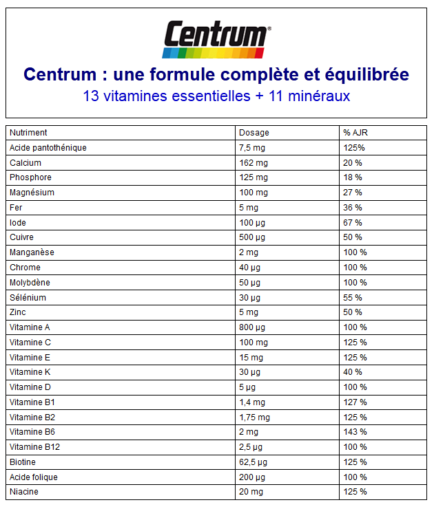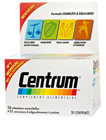 Centrum est un concentré de nutriments. 1 seul comprimé suffit pour compenser vos déséquilibres nutritionnels. Chaque comprimé contient une formule unique de 13 vitamines et 11 minéraux qui complètent votre équilibre nutritionnel, vous aident à libérer votre énergie, contribuent à votre immunité et vous procurent une peau saine.